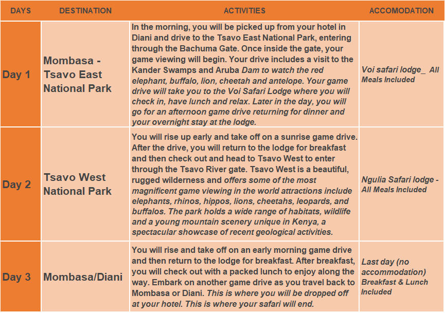 This 3-day safari includes a visit to both Tsavo East National Park and Tsavo West National Park. Tsavo East is known as the “Land of Lava, Springs, Man-eaters and Magical Sunsets”.